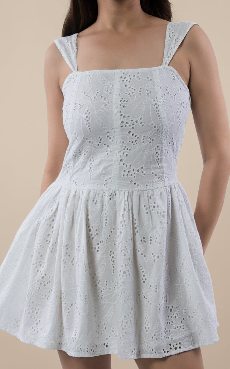 +There’s an effortless sweetness to this White Broderie Anglaise Mini Dress, with every detail designed to feel airy, feminine, and perfect for warm days. Crafted from crisp, breathable broderie in a pristine Snowdrop hue, it captures that timeless summer charm. The fitted bodice shapes the waist beautifully, while the mini skirt flares softly.