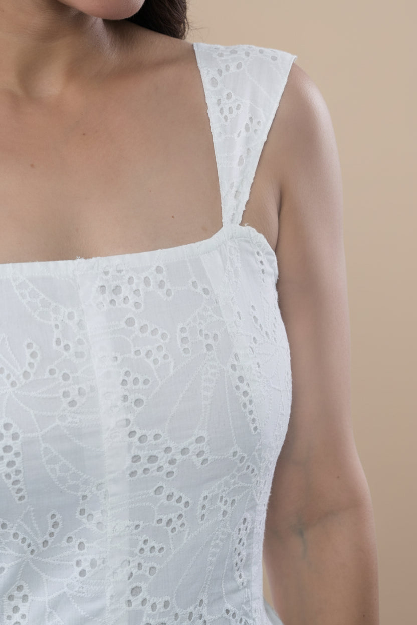Timeless white summer dress with delicate cutwork and romantic charm